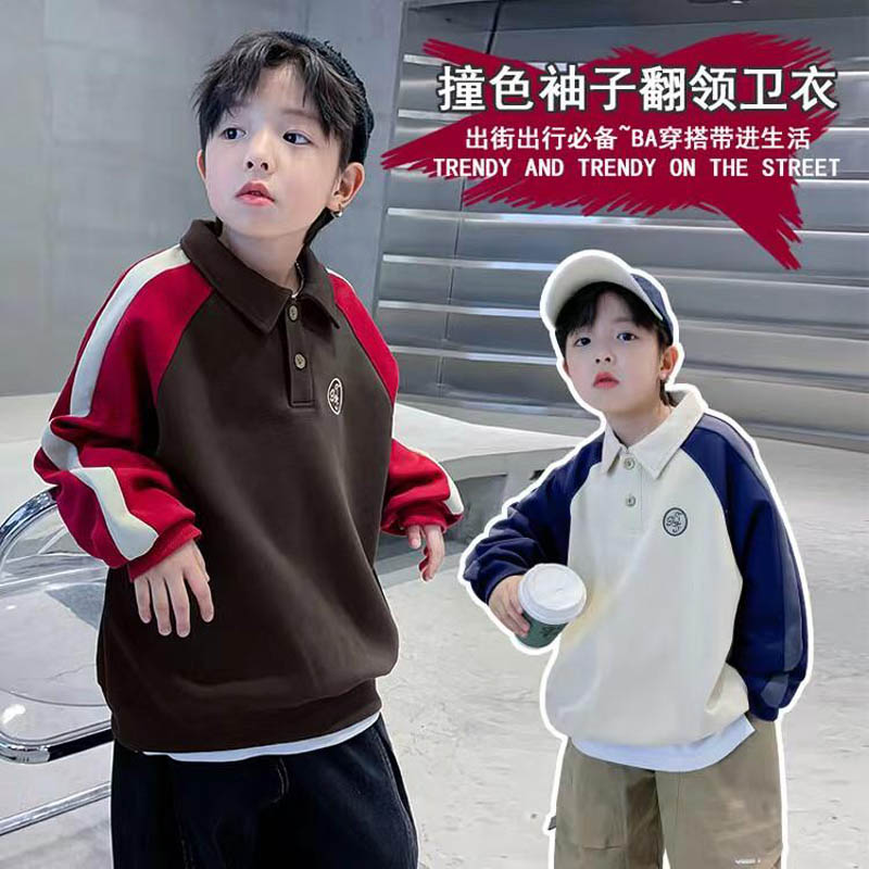 The boy wore a color-blocking sweatshirt in spring